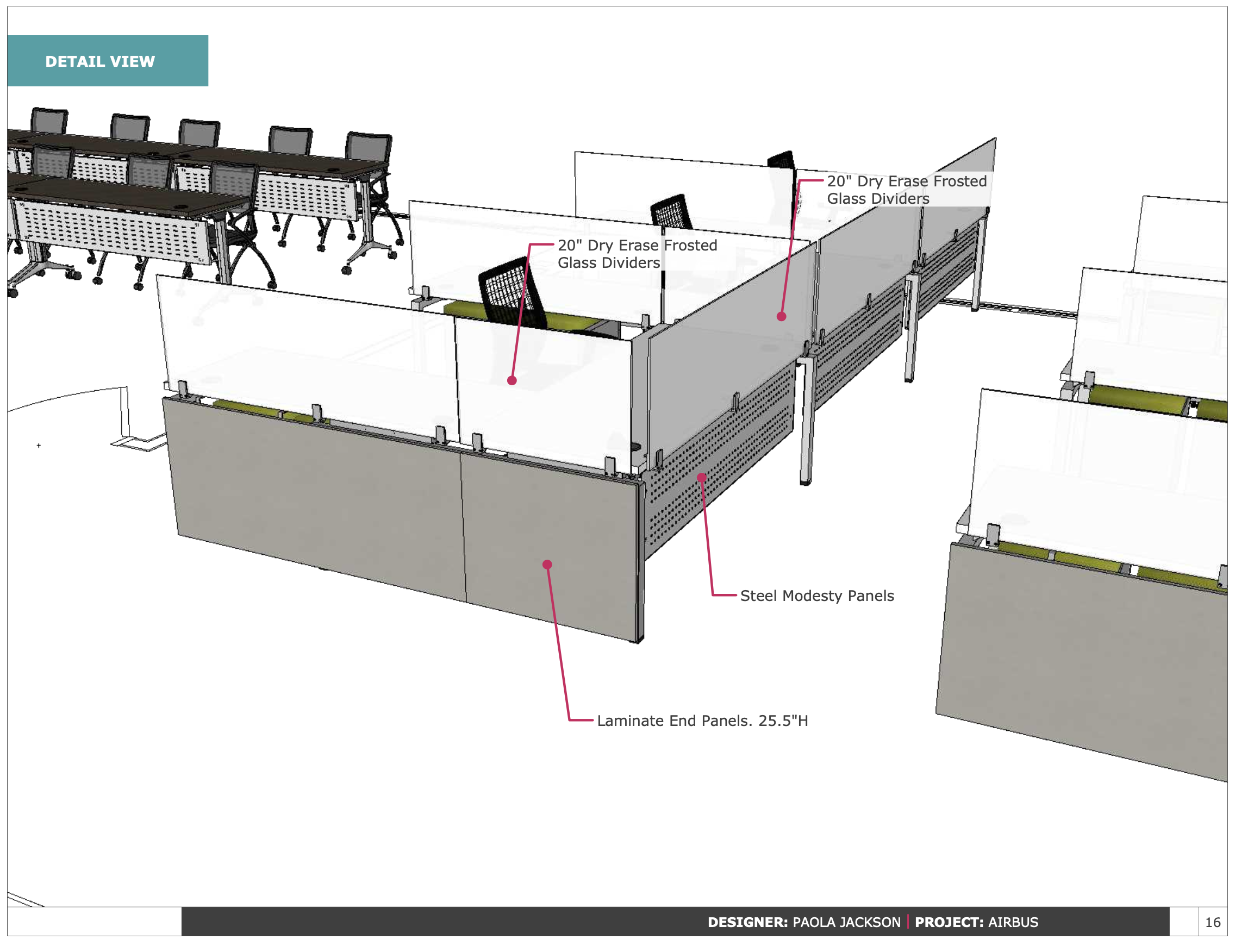 The workstations were provided by Clear Design. The series is called Blade. The workstations are 6’x7’6″‘ and encompass glass dry erase whiteboard privacy dividers. They include a drawer / drawer / file storage cabinet with a cushion on top for guest seating.