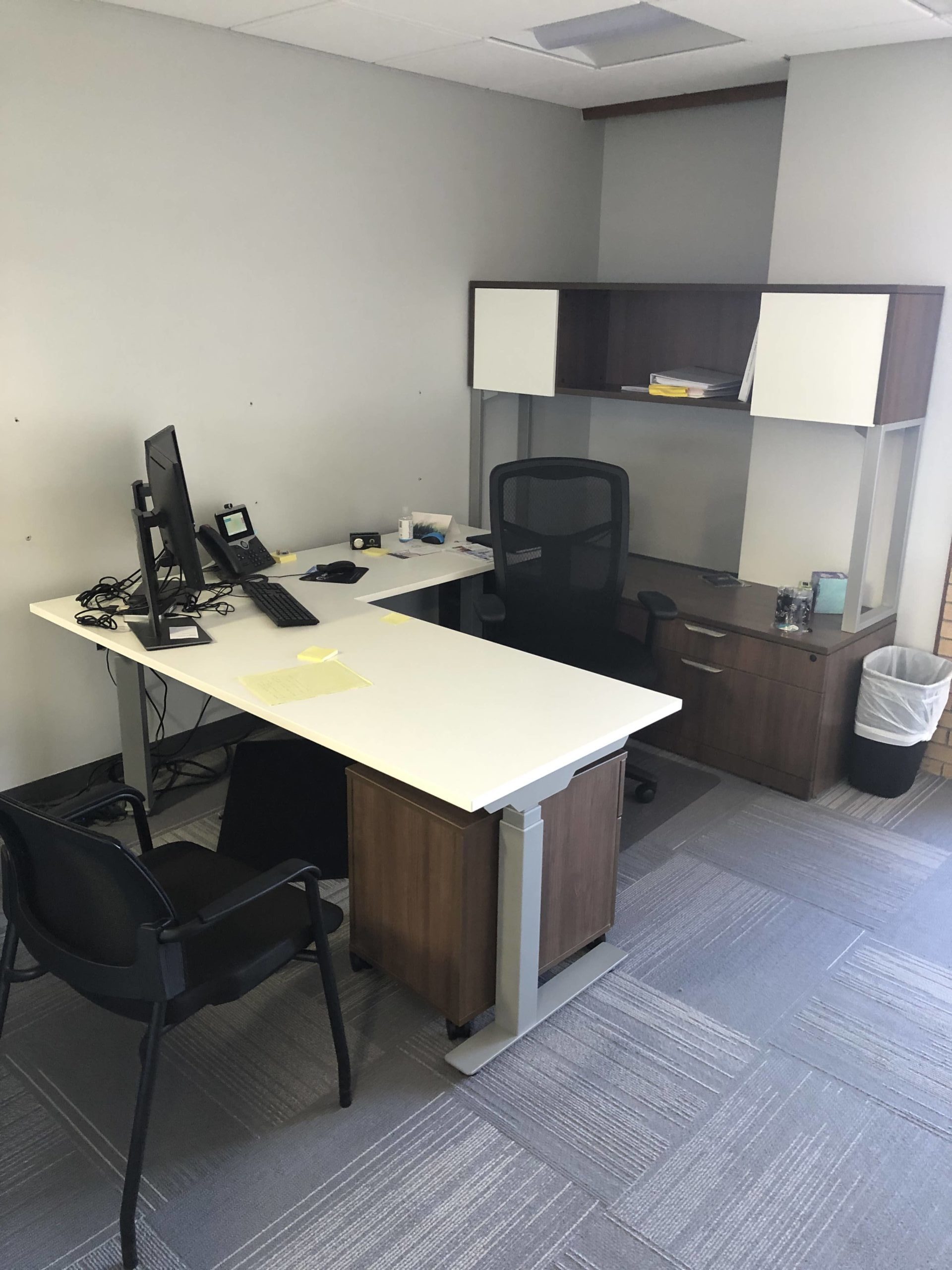 For the private offices, Palmer decided on L-shaped height-adjustable desks. This gives their team members the capability to sit or stand while they work. The credenza behind the desk has a wide variety of storage. Each team member at Palmers hand-selected their storage needs based on the company’s position. After all different roles require different amounts and types of storage. Each office decided they wanted a wall mount hutch storage unit with glass doors. This stylish look gives team members the capability to store binders or snacks. This is a great feature as it frees up desk space and can be hung to the team members personal height preference.